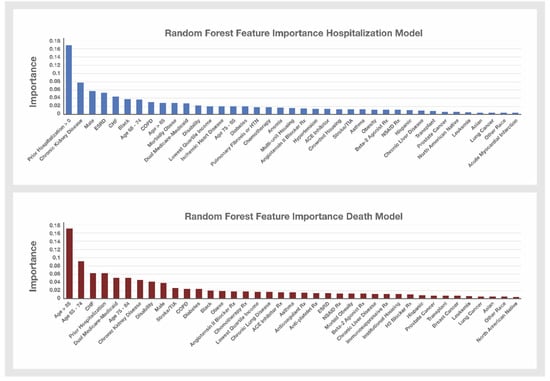 Random Forest Hospitalization and Death Model Feature Importance. Variables that were selected for inclusion in the Hospitalization and Death logistic regression models were used to build these two random forest models. The Feature Importance values for the variables not shown in the Hospitalization model graph are: prescriptions filled with sufficient quantity to overlap the COVID-19 diagnosis date for Azithromycin (FI 0.0104), Chloroquine and Hydroxychloroquine drugs (FI 0.0056), anticoagulant drugs (FI 0.0129), antiplatelet drugs (FI 0.0105), corticosteroids (FI 0.0118), and immunosuppressive drugs (FI 0.100); endometrial cancer (FI 0.002) or breast cancer (FI 0.006) between July and December 2019; unknown race (FI 0.0039) and HIV (FI 0.0045). The Feature Importance values for the variables not shown in the Death model graph include: prescriptions filled with sufficient quantity to overlap the COVID-19 diagnosis date for Azithromycin (FI 0.0107), Chloroquine and Hydroxychloroquine drugs (FI 0.0065), corticosteroids (FI 0.0134), anemia (FI 0.0189), unknown race (FI 0.004) and HIV (FI 0.0037).