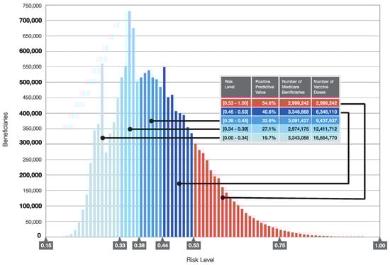 With the above limitations, the models we have developed provide important information for public health officials and advisory groups who recommend COVID-19 vaccination and other preventive behaviors to consider. Specifically, because the models integrating both socio-economic factors and individual clinical data respond to the recommendations of the NAM for prioritization and allocation of COVID-19 vaccines, they could be used to support planning a vaccination campaign. Figure 5 displays a histogram of the distribution of the predicted probabilities of hospitalization for SARS-CoV-2 infected patients, and when such data are mapped, they enable planners to estimate how many high-risk beneficiaries reside in a jurisdiction, and of those, how many are in socially vulnerable areas. Our models identifying individuals at risk for severe COVID-19 could also be used by the Medicare program, in collaboration with state and local health officials, to provide incentives for completion of COVID-19 vaccination and adherence to protective behaviors including wearing facemasks in settings with high risk of exposure to large doses of SARS-CoV-2 in aerosols. Additionally, as is done for electricity dependent persons in other emergencies, local health officials can request names and addresses of these beneficiaries in their jurisdictions, provided they can HIPAA-protect the data, and then could conduct direct outreach to beneficiaries at highest risk. Further, once receipt of vaccination is linked to Medicare claims, the analytic platform could be used to support post-licensure pharmacovigilance and effectiveness studies, especially for those identified at higher risk of severe COVID-19. These are of paramount importance, especially in the early phases of a vaccination campaign.