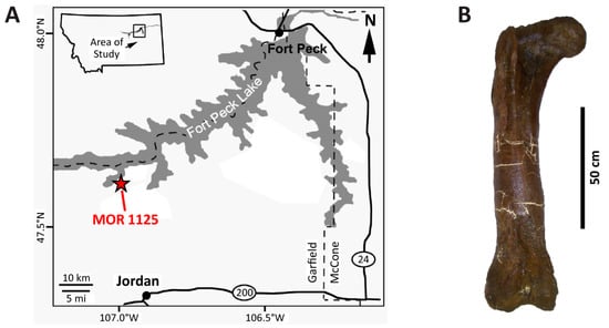 (A) Map showing the location of the MOR 1125 quarry in Garfield County, Montana. (B) Right femur of MOR 1125 examined in this study. Map modified from [] and bone photograph modified from [], each under CC BY-4.0 licenses.