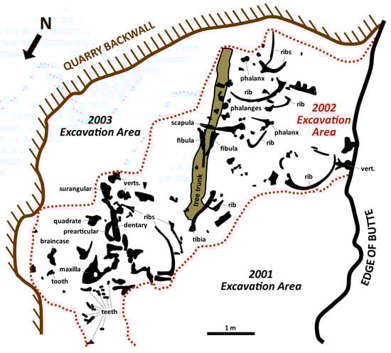 Quarry map from the 2002 field season at the MOR 1125 quarry. Only bones discovered during that field season are shown. Select identifiable bones are identified as labeled. Although the large tree trunk was found above all the bones in the central region of the quarry, it is shown behind them to allow the bones to be better seen. Scale bar as indicated.