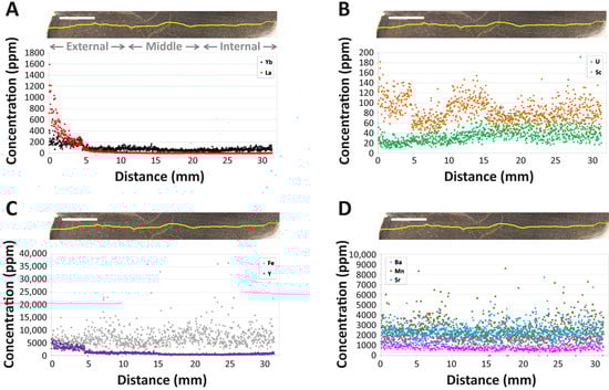 Although intermittent spikes in REE concentrations are present in osteonal tissue surrounding Haversian canals (indicative of uptake through vascular systems, e.g., brief Yb spike near 14 mm in Figure 4A), there are no obvious signs of a uniform deflection in elemental profiles reflective of significant double medium diffusion effects (cf. []). Instead, most trace element profiles exhibit a distinct plateau and then drop in concentrations at ~4.7 mm into the cortex (Figure 4). A fine, open, diagenetic crack passes diagonally across the laser transect at this depth. As shown in Figure 4A, REE concentrations are uniformly higher in the bone on the external side of this crack than on the internal side of it.