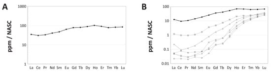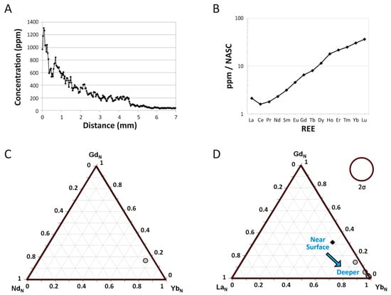 Although the external-most cortex of the femur exhibits considerably greater REE enrichment than deeper portions of the cortex (as is common in fossil bones, e.g., [,]; Figure 5A), the external 250 μm of the transect still exhibits an NASC-normalized pattern very similar to that of the bone as a whole (compare Figure 5B and Figure 6A), but with lesser relative enrichment in HREE. Both exhibit a modest negative Ce anomaly (visually evident as a downward deflection of the pattern at this element) and relative LREE depletion and HREE enrichment relative to MREE. Relative enrichment in HREE (perhaps resulting from uptake from brackish pore fluids; see Discussion) is also evident in how closely a data point for the whole-bone composition of MOR 1125 plots to the Yb corner of a NdN-GdN-YbN ternary plot (Figure 5C). In the external 250 µm of the cortex, shale-normalized concentrations range from ~30–100 times NASC values.