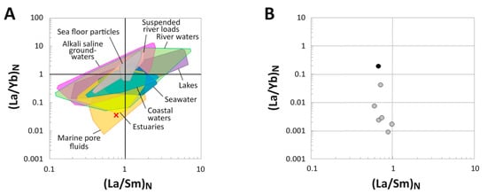 (La/Yb)N and (La/Sm)N ratios of the femur of MOR 1125. (A) Comparison of the whole-bone average (La/Yb)N and (La/Sm)N ratios of the fossil to ratios from various environmental waters and sedimentary particulates. Literature sources for environmental samples are provided in the Supplementary Materials. (B) REE compositions of individual laser transects expressed as NASC-normalized (La/Yb)N and (La/Sm)N ratios. The transect including the external bone margin is denoted by the black symbol, whereas all other (internal) transects are represented by gray symbols.