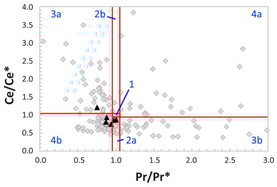 (Ce/Ce*)N vs. (Pr/Pr*)N plot (after []) of five-point averages along the transect across the cortex of MOR 1125 recorded by LA-ICPMS. Separate fields (labeled by blue text) are as follows: 1, neither Ce nor La anomaly; 2a, no Ce and positive La anomaly; 2b, no Ce and negative La anomaly; 3a, positive Ce and negative La anomaly; 3b, negative Ce and positive La anomaly; 4a, negative Ce and negative La anomaly; 4b, positive Ce and positive La anomaly. Measurements from the outer 1 mm of the external cortex are plotted as black triangles, and all measurements from deeper within the bone are plotted as grey diamonds. (Ce/Ce*)N and (Pr/Pr*)N anomalies, comparing observed (Ce, Pr) versus expected (Ce*, Pr*) concentrations of each element, are calculated as in the Materials and Methods section of the text.