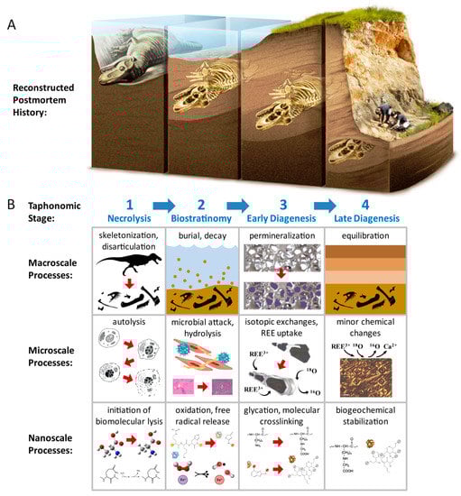 Reconstruction of the taphonomic and diagenetic history of Tyrannosaurus rex MOR 1125. (A) Generalized postmortem history of the carcass, sans disarticulation. Reprinted in modified form with permission from ref. []. Copyright 2016 Porto Editora. (B) Synopsis of macroscale, microscale, and nanoscale (molecular level) processes inferred to have taken place during each taphonomic stage in the decay of this specimen, as portrayed in (A). Nanoscale processes of biomolecular decay and stabilization based on propositions by [,,,]. Black Tyrannosaurus silhouette by Scott Hartman, www.phylopic.org (accessed on 8 August 2021), CC BY-NC-SA-3.0. Autolysis, REE uptake, biomolecular lysis, and glycation images each respectively modified, with permission, from [,,,,]. Hydrolysis image modified from [], and oxidation and crosslinking images modified from [], each under CC BY-4.0 licenses.