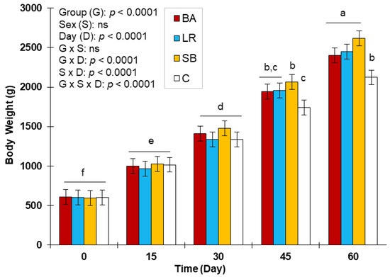 Effects of dietary supplementation with probiotics on live body weight (g) of healthy rabbits. (C): control group, (BA): Bifidobacterium animalis subsp. Lactis BB-12 group, (LR): Lactobacillus rhamnosus GG group, (SB): Saccharomyces boulardii CNCM I-745 group. LS-means (±SD) with different superscripts (a, b, c, d, e, f) are significantly different (p < 0.05).