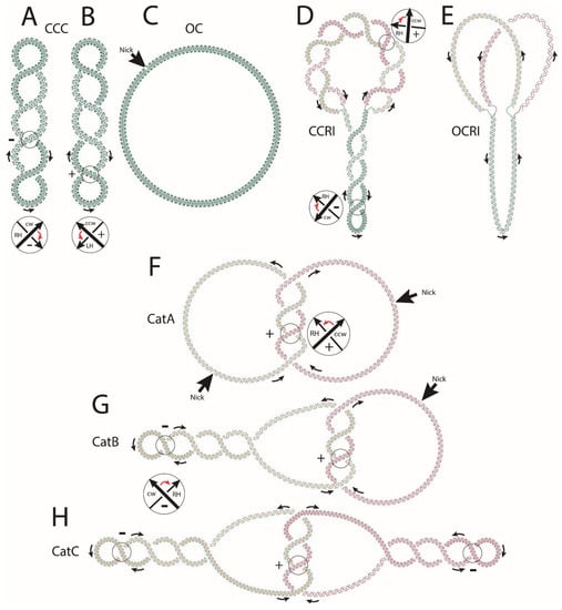 In Escherichia coli, DNA is negatively supercoiled [7]. During replication, progression of the replication forks demands opening of the DNA double-helix, and this process generates the formation and accumulation of (+) supercoiling ahead of the progressing forks. Two type II DNA topoisomerases, DNA gyrase and topoisomerase IV (Topo IV), cooperate to eliminate most of this (+) supercoiling, which transiently accumulates ahead of the replicating fork. However, the advancing bacterial DnaB helicase is by far more proficient at creating (+) supercoiling than DNA gyrase and Topo IV is at eliminating it [1]. It was proposed that during replication, swiveling of the progressing replication fork allows for the diffusion of some of this (+) supercoiling behind the fork, where it can be eliminated later-on [1]. In this way, the un-replicated region remains negatively supercoiled. Diffusion of each (+) supercoiling behind the fork, though, leads to the formation of two (+) intertwists of the sister duplexes for each (+) supercoil diffused from the un-replicated region (see Figure 1D). These intertwists are called “pre-catenanes” as they will become “catenanes” once replication is completed [5,6,8,9,10]. Figure 1D represents a half-replicated covalently-closed replication intermediate (CCRI) showing four (−) supercoils in the un-replicated region and eight (+) pre-catenane crossings in the replicated one. Figure 1E represents an open-circle replication intermediate (OCRI) showing no supercoiling in the un-replicated region and no pre-catenanes in the replicated one. As previously mentioned, pre-catenanes become full catenanes once replication is completed. At this time, DNA gyrase starts to introduce (−) supercoiling into one or both of the fully replicated sister duplexes [11]. This explains the formation of three types of fully replicated catenanes: catenanes type A (CatAs), formed by intertwined sister duplexes that are still nicked and therefore relaxed (Figure 1F); catenanes type B (CatBs), formed by intertwined sister duplexes where one of them is nicked and relaxed and the other covalently closed and negatively supercoiled (Figure 1G); and catenanes type C (CatCs), formed by intertwined sister duplexes where both of them are covalently closed and negatively supercoiled (Figure 1H). All these basic DNA topological conformations have been described in detail by Schvartzman et al. [6].