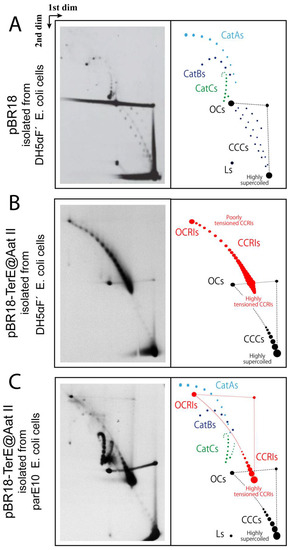 pBR-TerE@AatII DNA (Figure 2) was analyzed in high-resolution 2D agarose gel electrophoresis. The 2D gel electrophoretic mobility of non-replicating supercoiled CCCs and relaxed OCs forms as well as partially replicated forms CCRIs and OCRIs and catenated molecules (Cats) varies according to their compaction and allows their identification (Figure 3A–C). The different mobility of all these molecules has been extensively evaluated in 2D gel electrophoresis [5,56,60,69], and the topology of each population has been confirmed by electron microscopy and atomic force microscopy [26,56,70]. In pBR18, containing no RFB, the most prominent forms of the plasmid DNA isolated from DH5αF’ E. coli cells were supercoiled CCCs; OCs; and a few fully replicated CatAs, CatBs and CatCs (Figure 3A). In pBR-TerE@AatII, the most prominent forms of the plasmid DNA isolated from DH5αF’ E. coli cells (Figure 3B) were CCRIs and OCRIs. In addition, highly supercoiled CCCs and some OCs were also observed. In pBR-TerE@AatII DNA isolated from parE10 E. coli cells where the last 60 min of culture occurred at 43 °C (Figure 3C), the most prominent forms of the plasmid were fully replicated CatAs, CatBs and CatCs. In addition, highly supercoiled CCCs and some OCs were also observed. Note that all the replication intermediates here analyzed have the unidirectional replicating fork stalled at TerE [26,56,60]. The nicks responsible for the formation of OCs and OCRIs were probably induced during DNA isolation [71]. The conditions of 2D gels here used allow for the identification of CCCs with a ∆Lk between 0 and approximately 20. The signal pointing highly supercoiled CCCs corresponds to a mixture of molecules with different ∆Lks, including negatively as well as positively supercoiled circles [11,56,71].