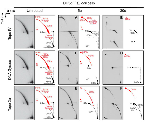 Immunograms and interpretative cartoons of intact untreated and treated forms of pBR-TerE@AatII isolated from DH5αF’ E. coli cells analyzed by two-dimensional agarose gel electrophoresis. The immunograms to the left correspond to the untreated sample and are only shown for comparison. Samples were treated with 15 units (A,C) or 30 units (B,D) of the topoisomerases in vitro, as indicated in Material and Methods, except for topo 2α, where 30 units (E) and 60 units (F) were used (indicated by an asterisk at the left down corner). Non-replicating (+) and (−) CCCs and OCs are depicted in black. Dashed straight lines correspond to smears of the most abundant species that occur during the first and second electrophoresis. CCRIs and OCRIs are depicted in red. Where it applies, fully replicated catenanes—CatAs, CatBs and CatCs—are depicted in light blue, dark blue and green, respectively. The positions of highly supercoiled as well as highly and poorly tensioned CCRIs are indicated. The immunograms on top correspond to samples treated with Topo IV; below are the immunograms that correspond to samples treated with DNA gyrase and at the bottom the immunograms that correspond to samples treated with Topo 2α as indicated in Material and Methods. * In this case a different number of units was used.