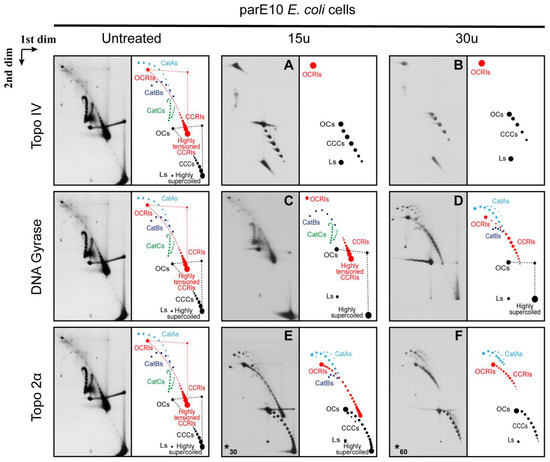 Immunograms and interpretative cartoons of intact untreated and treated forms of pBR-TerE@AatII isolated from parE10 E. coli cells where the last at 60 min occurred at the restrictive temperature (43 °C). All the samples were analyzed by two-dimensional agarose gel electrophoresis. The immunograms to the left correspond to the untreated sample and were only placed for comparison. Samples were treated with 15 units (A,C) or 30 units (B,D) of the topoisomerases in vitro, as indicated in Material and Methods, except for topo 2α, where 60 units (E) and 240 units (F) were used (indicated by an asterisk at the left down corner). CCCs and OCs are indicated in black. Dashed straight lines indicate smears of the most abundant species that occur during the first and second electrophoresis. CCRIs and OCRIs are depicted in red. Where it applies, fully replicated catenanes (CatAs, CatBs and CatCs) are depicted in light blue, dark blue and green, respectively. The position of highly supercoiled and highly tensioned CCRIs is indicated. The immunograms on top correspond to samples treated with Topo IV; below are the immunograms that correspond to samples treated with DNA gyrase and at the bottom the immunograms correspond to samples treated with Topo 2α as indicated in Material and Methods. * In this case a different number of units was used.