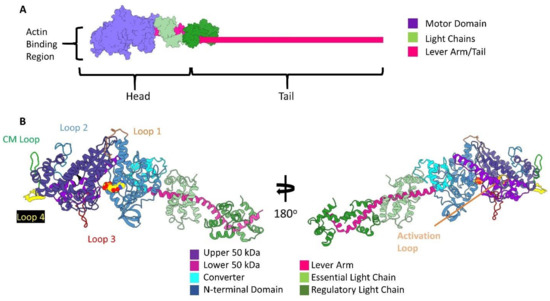 - Masters, T.A.; Kendrick-Jones, J.; Buss, F. Myosins: Domain Organisation, Motor Properties, Physiological Roles and Cellular Functions. Handb. Exp. Pharmacol. 2017, 235, 77–122. [Google Scholar] [CrossRef]
