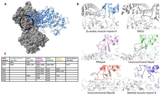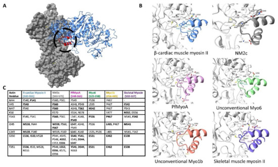 - Robert-Paganin, J.; Xu, X.-P.; Swift, M.F.; Auguin, D.; Robblee, J.P.; Lu, H.; Fagnant, P.M.; Krementsova, E.B.; Trybus, K.M.; Houdusse, A.; et al. The actomyosin interface contains an evolutionary conserved core and an ancillary interface involved in specificity. Nat. Commun. 2021, 12, 1892. [Google Scholar] [CrossRef]