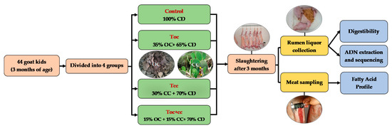 This experiment was performed in the experimental farm of the Regional Center of Agricultural Research of Tangier (INRA-Morocco) that is located at 35°67′ N and 5°85′ W. On this farm, the goat herd is of Beni Arouss Breed. This is a North Moroccan indigenous breed, well adapted to the local conditions. It is characterized by a red coat and an average bodyweight of about 42 and 38 kg for males and females, respectively [34], and an average milk production of about 600 mL/day during a lactation period of three months [35]. In the experiment, forty-four male goat kids of Beni Arouss, with an initial body weight of 10.5 ± 0.1 kg, aged three months were divided into four groups on a bodyweight basis and individually housed. During the three months of the experiment, all groups received oat hay complemented by a concentrate diet. As shown in Table 1, which presents the distributed diets and their chemical composition and nutritive value, the control group received a conventional concentrate based on barley as a source of energy and faba bean as a nitrogen source, as used by the local breeders. The other test groups received a concentrate with OC and/or CC of Opuntia ficus indica in addition to faba beans. The concentrate of the first test group (Toc) contained 35% of OC, and 30% of CC was incorporated in the second test group (Tcc) diet. The last group (Toc+cc) had an administration of 15% of both (Figure 1). The OC was obtained from olive oil mills that used mechanical press process, located in Ouazzane town in Northern Morocco during the period of oil extraction (November to January). The crude OC was dried under a plastic greenhouse and conserved in plastic bags in hermetic conditions until the experiment. As for CC, they were provided daily from shrubs nearly installed. The spines of CC were manually removed, and cladodes were manually cut to slides of 9 cm2. The ingredients of the diet were ground and mixed to be distributed two times per day. The offered rations were adapted to allow 10% of orts that were quantified daily to determine the dry matter intake (DMI) as described by Palmieri et al. [36].