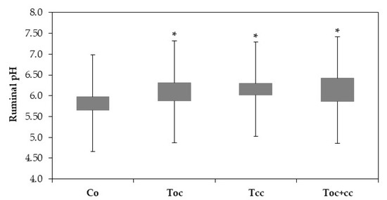 Ruminal pH of goat kids according to diets. Co: control; TOC: 35% olive cake; TCC: 30% cactus cladodes; TOC+CC: 15% olive cake + 15% cactus cladodes; *: groups with * are significantly different from the Co group at p < 0.05.