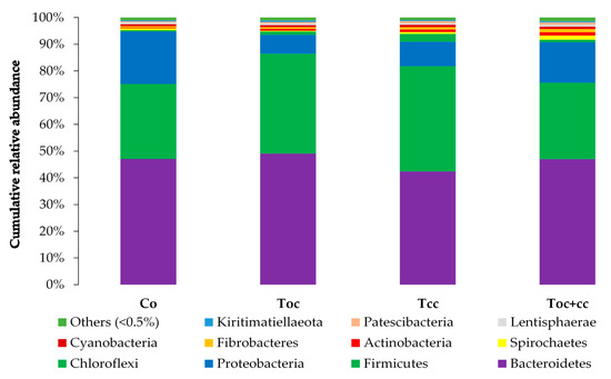 Cumulative relative abundance of bacterial community phylum according to distributed diet. Co: control; Toc: 35% olive cake; Tcc: 30% cactus cladodes; Toc+cc: 15% olive cake + 15% cactus cladodes.