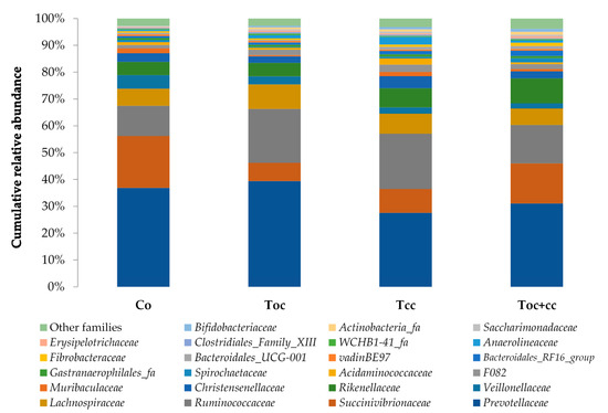 Cumulative relative abundance of bacterial community families according to distributed diet. Co: control; Toc: 35% olive cake; Tcc: 30% cactus cladodes; Toc+cc: 15% olive cake + 15% cactus cladodes.