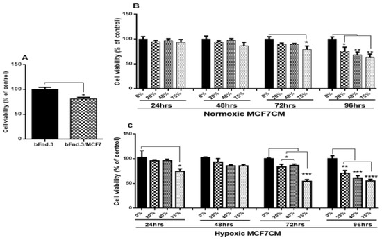 Figure 2C) conditions. The effects of bEnd.3 exposed to hypoxic MCF7CM was much more pronounced than bEnd.3 cells exposed to normoxic MCF7CM. Furthermore, our data indicate that cell viability was not affected within the 48 h, and whereas only the highest concentration (75%) of normoxic MCF7CM depressed viability at 72 h, all concentrations suppressed BEC viability by treatment with hypoxic MCF7CM. The delayed response in viability to MCF7CM treatment also indicated that the process whereby endothelial cells are affected is manifested after several iterations of cell division. Furthermore, although there is a similar profile between normoxic and hypoxic derived MCF-7CM, the more pronounced effects under hypoxic conditions suggests that breast cancer cells accelerate and increase their paracrine secretory effects on endothelial viability.