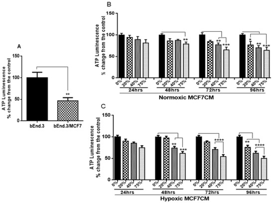 41]. In the present study, the investigation of ATP generation in brain endothelial cells under the influence of cancer was necessary. Therefore, bEnd.3 cells, chronically exposed to both MCF7 cells and their MCF7CM, were monitored for their ATP production using a luminescence assay. Results show a marked reduction of ATP generation in bEnd.3 cells co-cultured with MCF7 cells (