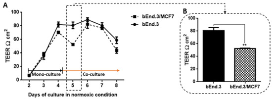 Figure 6A). This window of transient decreased TEER may indeed assist the breast cancer cells by providing a window for migration across the BBB. We also investigated whether co-culturing MCF7 cells with bEnd3 cells under hypoxic conditions (5% O