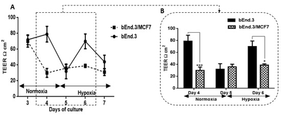 In addition, bEnd.3 cells and MCF7 cells were grown separately in similar conditions for 72 h, then the two cell lines were co-cultured by placing the bEnd.3 inserts in the MCF7 well plates. The co-cultured cells were incubated in normoxic conditions (21% O2) for 24 h, then incubated in hypoxic conditions (5% O2) for the rest of the experimental time frame. TEER was measured daily starting from day three.