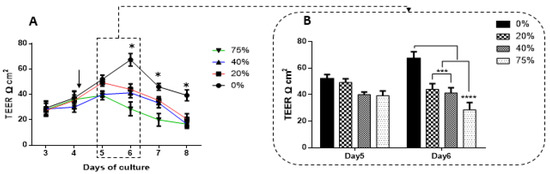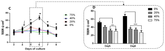 The recording of TEER across most monolayers typically follows a biphasic response where TEER initially increases to a peak, plateaus and then gradually decreases. We compared peak TEER responses on days five and six after exposing bEnd3 monolayers with selected concentrations of MCF7CM under normoxic (21% O