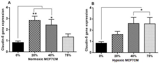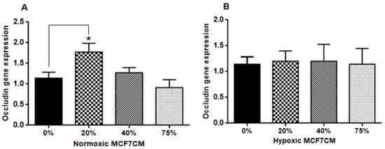 Figure 10, respectively). Normoxically derived MCF7CM had similar effects on both Occludin and Claudin-5 expression with increasing concentration of MCF7CM resulting in dose-related suppression in gene expression relative to treated samples. Relative to controls, only the lowest concentration of normoxically derived MCF7CM produced an elevated expression of Occludin. Surprising, hypoxically derived MCF7CM had no statistical effect relative to controls. However, bEnd.3 cells which were exposed to hypoxically derived MCF7CM, significantly produced an elevated expression of Claudin-5. Increased levels of Claudin-5 is usually correlated with increased TJs proteins at the apico-lateral membrane of endothelial cells, with the concomitant increase in TEER. However, our data always produced a decrease in TEER after exposure to MCF7CM. Thus, MCF7CM based paracrine factors may be involved in the prevention of the incorporation of TJ proteins at the apico-lateral membranes or the mechanism by which cancer secretions decrease the endothelial resistance is not mediated by the tight junction at the paracellular route, but via increased transcellular permeability resulting in the decrease in TEER. In view of reports that activated cancer cells release various types of metalloproteinase enzymes, which depredate the tight junction proteins [