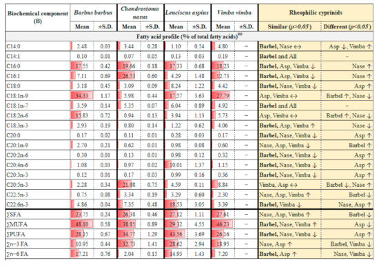 Juvenile to sub-adults (length range 6–25 cm) of four rheophilic cyprinids (barbel Barbus barbus, nase Chondrostoma nasus, asp Leuciscus aspius, and vimba bream Vimba vimba) were collected (minimum six individuals each) from previously known locations (either from established research stations or information from sport fisheries association members) on River Vltava and River Berounka, the Czech Republic during the middle of the vegetative season (summer; May–August). Wild fishes were electro-fished (220–250 V, 1.5–2.5 A, 63 Hz) and sacrificed with a quick blow to the head. The whole body was immediately put in iceboxes, brought back to the laboratory, made whole-body mash, and stored frozen at −80 °C. The frozen samples were sent to an accredited third-party laboratory (Agrola s.r.o.) for the analyses of dry matter, crude protein, crude lipid, crude ash, crude fiber, altogether called proximate composition; according to ISO certified methods (e.g., ISO 11465:1993, ISO 16634-1, ISO 1443:1973, ISO 1575:1987, ISO 5498:1981). Additionally, essential amino acids (EAA), non-essential amino acids (NEAA), and total phosphorus (P), were analyzed (e.g., ISO 6491:1998, ISO 13903:2005). Amino acids included methionine, lysine, threonine, aspartic acid, serine, glutamic acid, glycine, alanine, tyrosine, valine, phenylalanine, isoleucine, leucine, histidine, arginine, cysteine, proline, tryptophan. They were analyzed following HCl digestion. ninhydrin derivatization and ion chromatography. Fatty acids analyses were carried out in our own laboratory following hexane-isopropanol extraction, fatty acid methyl esterification, and gas chromatography with flame ionization detection [26].