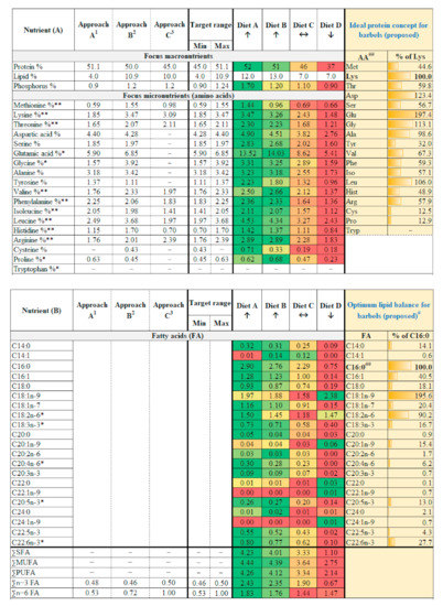 Barbel’s target nutrient range was calculated using three principally different approaches (Figure 2). Comparing the approaches used, neither one of them is safe enough individually. All three approaches, when considered altogether, may be a safer and valuable tool for calculating the target range of nutrients in the diet. For example, while approach ‘A’ has not underestimated protein levels, there is a potential under-estimation of essential amino acids (EAAs) methionine and lysine. Whereas approach ‘C’ potentially takes care of EAAs methionine and lysine but under-estimates protein and other EAAs histidine and leucine (which was projected adequately by ‘A’) (Figure 2). In a nutshell, the approaches complement each other. The median of the target range or the target range itself can be used as the baseline for diet selection.