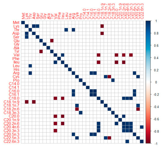 Pearson’s 2-tailed correlogram (at p < 0.05) on associations between mean body amino and fatty acids of some native, large-bodied rheophilic cyprinids of Central European drainage systems (barbel, nase, asp, and vimba bream). Note the significant associations of long-chain FAs with some consistent AAs (valine, phenylalanine, arginine, and cysteine). Fatty acids notations (dash) are auto-formatted while generating correlogram in RStudio, the standard notations of the same FAs can be found in Figure 1.