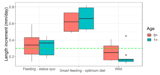 Length increment in captive (feeding regimen wise) versus wild Barbus barbus. Green horizontal dashed line indicates ‘reasonably good size increment’ (i.e., above median). Black dots indicate some outliers in European river populations. Smart feeding-optimum diet = diets A, B. Feeding-status quo = diets C, D + some previous growth trials (sources in Supplementary Appendix-III). Wild = European rivers metadata (sources in Supplementary Appendix-III).