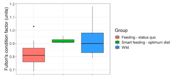 Body fitness (Fulton’s condition factor) of wild versus captive (feeding regime wise) Barbus barbus. Smart feeding-optimum diet = diets A and B. Feeding-status quo = diets C, D + some previous growth trials (sources in Supplementary Appendix-III). European rivers = wild data (sources in Supplementary Appendix-III).