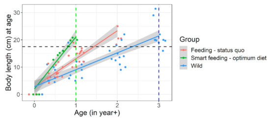 In a nutshell, results from the growth trials validate our approach of target nutrient range calculation and categorization or selection of diets around the calculated target nutrient range. Within the limitations of our selected diets, our results hint at an indicative crude protein, amino acids, phosphorus, and fatty acids (optionally) range that may be suitable for raising barbel juveniles in the context of riverine stocking. An ideal commercial diet can be selected mimicking nutrition levels in diet A (ideally) or at least diet B (i.e., following green cells in Figure 2) for hatchery raising of 0+ or 1+ barbel juveniles. It would help to achieve best possible size-at-release within shortest possible time. For example, approximately ≈ 20 cm total length by ≤1+ age was achieved, that too with good Fulton’s condition factor (body fitness). It is usually achieved in 2+ or 3+ year age groups under conventional hatchery raising or rivers, respectively (Figure 6 and Figure S4). For achieving a steep growth trajectory or realizing full growth potential of these species (Figure 6 and Figure 7), both optimum feed and feeding conditions are crucial (presented below).