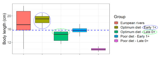 Size suitability of captive raised Barbus barbus under different feeding regimen for river stocking purposes. Blue horizontal line indicates a representative body length of juvenile barbels in European rivers (=15.7 cm). Colored circles indicate convincing (blue) or nearly convincing (green) stocking size suitability, at a very young age (8–13 months old). European rivers data: (sources in Supplementary Appendix-III).