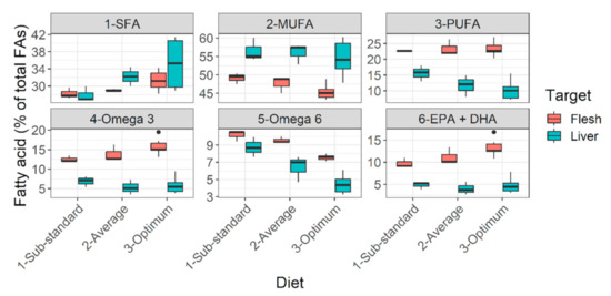 Lipid deposition pattern of Barbus barbus in liver and flesh under different diets. Optimum diets = diets A, B. Average diet = diet C. Sub-standard diet = diet D. Abbreviations: FAs, fatty acids; SFA, saturated fatty acids; MUFA, monounsaturated fatty acids; PUFA, polyunsaturated fatty acids; EPA + DHA, sum of eicosapentaenoic acid and docosahexaenoic acid. Notice the decreasing trend of essential lipid reserves (PUFA p > 0.05, Omega-3 p < 0.05, EPA + DHA p < 0.05) from optimum to sub-standard diet. May be collated with the color pattern in Figure S1.