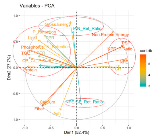 Within our graded levels of diet selection (Figure 2 and Table S1), protein, lipid, phosphorus are the closest and significant drivers of thermal growth coefficient (TGC; hereinafter referred to as ‘growth’) (Figure 10). As expected, the growth increased with increasing dietary amino acids and fatty acids (Figure S5). Comparing the proximity of the TGC vector with amino or fatty acids vectors (Figure S5), TGC may have responded most strongly (compared with other AAs) with increasing proportions of sulfur-containing AAs (methionine + cysteine) and aromatic AAs (phenylalanine + tyrosine) from diet D to Diet A. Also, diets with higher omega-6 fatty acids (n-6 FAs) did not seem to have negative repercussions on growth; a positive correlation was found (Figure 10). Dietary non-protein energy to protein ratio (NPE:P) ratio, and carbohydrate content were negatively correlated with growth; their contribution was strong (Figure 10). Protein (N) and P retentions were positively correlated with growth (Figure 10, Table 1 and Table 2). They were also significantly higher (p < 0.05) under diet A which comfortably fulfilled or fell well above the target nutrient range (Table 1 and Table 2). When dietary amino acids are well above the target nutrient range, protein efficiency ratio by fishes are significantly (p < 0.05) improved (e.g., diet A; Table 1 and Table 2). The NPE:GE retention ratio was negatively related to growth (Figure 10).