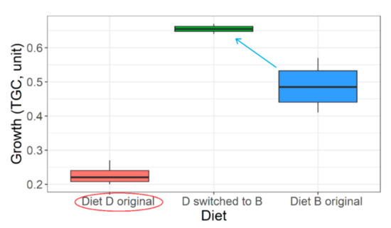Despite providing diets with near optimum nutrition levels, proper pre-conditions for efficient feeding are often not taken care of. Or proper feeding conditions are provided but without optimum diets. If poor diets are mistakenly selected in the hatcheries initially, the mid-0+ to early 1+ fish still offer something called ‘compensatory growth mechanism’ when switched to an optimum diet (Figure 11). However, the nutritional distance between the diets must be significant (diet B significantly better than diet D, p < 0.05; Figure 11). Achieving optimum growth also depends on feed rationing; optimum feeding maybe at 4–6% of body weight (Figure S6). Growth trajectory usually dampens around 12–18 cm total body length or 17–19 kg m−3 density. However, an optimum diet may help to delay such dampening, and optimum growth rate is realized longer. Besides, selection of summer-like water temperatures through the rearing period (~22–23 °C) and mild flow conditions to enable feeding (~3 L min−1 or 300% water exchange per hour) are necessary.