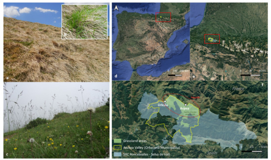 The Aezkoa valley (Navarra county, Spain) is the westernmost valley of the southern Pyrenees (42.53–43.3′ N, 1.8–1.17′ W) (Figure 1d). The climate is snowy and cold in winter, and mild and foggy in summer. The annual temperature averages 9.3 °C and the accumulated precipitation reaches 1856 mm per year (Irabia climatic station, http://meteo.navarra.es accessed on 17 October 2021). The landscape is a mosaic of forests (e.g., Fagus sylvatica, Abies alba), shrubland communities (e.g., Erica spp., Ulex gallii) and grasslands. The area of study is part of the Special Area of Conservation (SAC) Roncesvalles-Selva de Irati (code ES0000126; Figure 1f) and is located in the north of the valley. High-altitude grasslands (800–1400 m asl) comprise diverse communities of perennial grasses (Festuca gr. rubra, Agrostis capillaris, Brachypodium rupestre, Danthonia decumbens), forbs (Achillea millefolium, Potentilla erecta, Gallium saxatile) and legumes (Trifolium repens, Lotus corniculatus). Sandstones and calcareous clays dominate the substrate, upon which develop acidic, deep and organic soils, with clay-loamy and loamy textures.