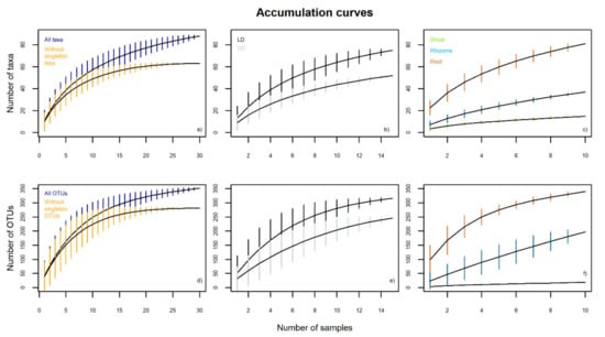 The quantitative data from metabarcoding, based on read sequences, allowed an exhaustive characterization of the endophytic diversity of B. rupestre. Both the OTUs (352) and the clustering of OTUs into taxa (88) produced non-asymptotic species accumulation curves (Figure 2). However, 23 out of 88 taxa and 71 out of 352 OTUs were sequenced in only one sample (designated as singletons). Additional curves were constructed without singletons, suggesting that an increase in sampling effort would increase the number of rare taxa/OTUs but not the more common ones (Figure 2a,d). Accumulation curves comparing tissues and grassland types did not approach horizontal asymptotes (Figure 2b,c,e,f), therefore, greater sampling effort is required for reliable richness estimates.