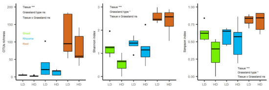 OTU richness and diversity indexes (Shannon and Simpson) for the endophytic community of B. rupestre from different tissues and grasslands (LD: low-diversity grassland, HD: high-diversity grassland). *** p-value < 0.001; * p-value < 0.05 and ns = no significance. Black points represent outliers.