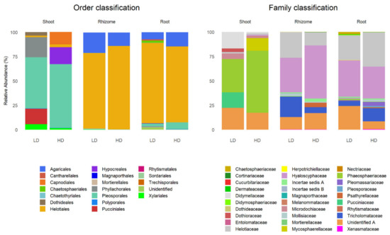 Taxonomic structure (orders, left and families, right) of fungal endophytes in B. rupestre tissues (shoot, rhizome and root) in the different grassland types (LD: low-diversity grassland, HD: high-diversity grassland).