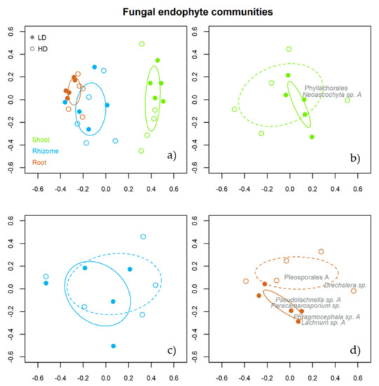 Non-metric multidimensional scaling analysis (NMDS) for the endophytic community of B. rupestre according to the effect of tissue (a) and plant diversity (shoot 1b, rhizome 1c & roots 1d). The ellipse formed by the solid line encompasses the fungal composition of B. rupestre tissues (a). The ellipses formed by broken and solid lines encompass the fungal composition of the low and high-diversity grassland, respectively (b–d). The taxon names in the graphs for shoots (b) and roots (d) are the indicator species for the effect of plant diversity.
