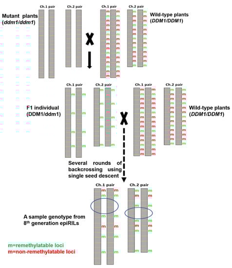 - Mirouze, M.; Lieberman-Lazarovich, M.; Aversano, R.; Bucher, E.; Nicolet, J.; Reinders, J.; Paszkowski, J. Loss of DNA methylation affects the recombination landscape in Arabidopsis. Proc. Natl. Acad. Sci. USA 2012, 109, 5880–5885. [Google Scholar] [CrossRef] [PubMed]
