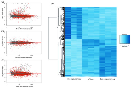 Visualization of gene expression datasets in turbot brains throughout the developmental metamorphosis process. MA plot of all transcriptome genes from pairwise comparisons: (a) pre-metamorphic vs. climax, (b) climax vs. post-metamorphic and (c) pre-metamorphic vs. post-metamorphic. The red dots plotted represent genes with an adjusted p-value < 0.1, while gray dots are those genes that do not show the established significance between the different stages. (d) Heatmap displaying the DEGs hierarchically clustered according to the expression profiles throughout metamorphosis. Each column represents an individual triplicate from each metamorphic stage (pre-metamorphic, climax and post-metamorphic) and each row represents different DEGs. The colors from light blue to dark blue indicate gene expression from low to high, respectively.