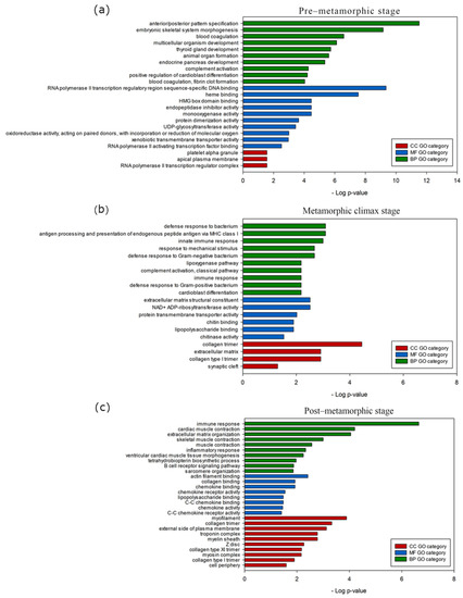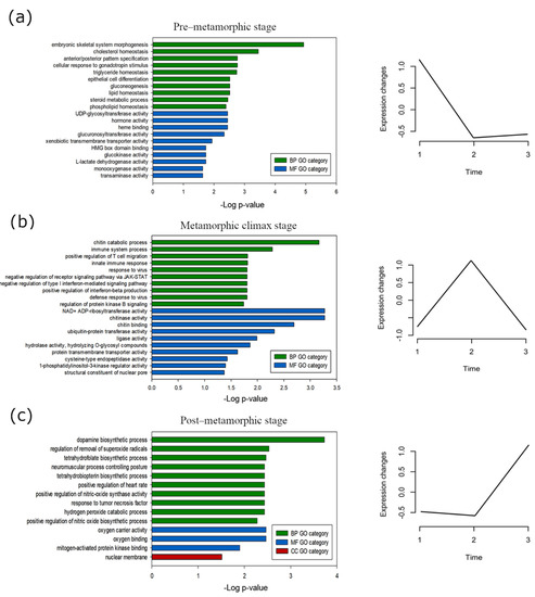 Additionally, we performed a GO enrichment analyses of the selected clusters (Figure 6). In the pre-metamorphic stage, the gene set from clusters selected showed significant enrichment of early development-related BP GO terms, such as embryonic skeletal system morphogenesis (GO:0048704), cholesterol homeostasis (GO:0042632) and anterior/posterior pattern specification (GO:0009952). For MF ontology, the most significant GO terms were UDP-glycosyltransferase activity (GO:0008194), hormone activity (GO:0005179) and heme binding (GO:0020037) (Figure 6a; Supplementary Table S15). Clusters with genes with an overexpressed expression pattern at climax were associated with immune response-related BP GO terms, such as chitin catabolic process (GO:0006032), immune system process (GO:0002376) and positive regulation of T cell migration (GO:2000406). NAD+ ADP-ribosyltransferase activity (GO:0003950), chitinase activity (GO:0004568) and chitin binding (GO:0008061) were the most highly represented MF GO terms (Figure 6b; Supplementary Table S16). Finally, the post-metamorphic clustered genes exhibited a significant enrichment in GO terms, including dopamine biosynthetic process (GO:0042416), regulation of removal of superoxide radicals (GO:2000121) and tetrahydrofolate biosynthetic process (GO:0046654) in the BP category; oxygen carrier activity (GO:0005344), oxygen binding (GO:0019825) and mitogen-activated protein kinase binding (GO:0051019) in the MF category; and nuclear membrane (GO:0031965) in the CC category (Figure 6c; Supplementary Table S17).