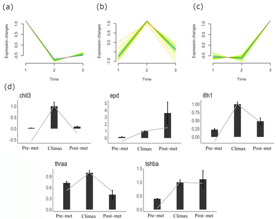 Selected clusters from Mfuzz soft clustering analysis of DEGs in turbot brains throughout the developmental metamorphosis process. DEGs show up-regulated genes corresponding to the: (a) pre-metamorphic stage, (b) climax stage, (c) post-metamorphic stage. Color code, from magenta to yellow, denote high or low Mfuzz membership values, respectively. Time 1, 2 and 3 in X-axis corresponds to pre-metamorphic, climax and post-metamorphic stage, respectively. (d) Validation of expression patterns of chit3, epd, thra, tshba, and ifih1 genes in the turbot brain using qPCR. In the bar plots, the trend lines represent the fold change obtained by analyzing the RNAseq values during the metamorphic stages. The bars represent the fold change values obtained by qPCR. Results were normalized to 18S gene and expressed as the mean ± SEM of two independent experiments. Data from climax stage was set at 1.