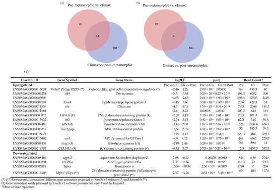 The most significantly up-regulated and down-regulated DEGs in the turbot brain at the climax stage of metamorphosis. Venn diagrams show (a) up-regulated and (b) down-regulated DEGs after pairwise comparisons between metamorphic stages (pre-metamorphic vs. climax and climax vs. post-metamorphic). (c) Gene annotation proposed by Sma3s v2 software3.5, fold change values (Log2FC), p-values adjusted (padj) and read count of each sample.
