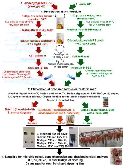 To prepare the L. monocytogenes and LAB inocula, 100 µL of a stock culture (stored in Brain Heart Infusion (BHI) broth (Pronadisa, Madrid Spain) containing 20 % (w/v) glycerol at −80 °C) was sub-cultured twice onto BHI broth at 37 °C for 24 h and Man Rogosa Sharpe (MRS) broth (Fisher Bioreagents, Belgium) at 30 °C for 48 h, respectively (Figure 1). At the end of the incubation period, a suspension containing ≈ 8.0 log CFU/mL cells was obtained and an aliquot of this was diluted in 1% (w/v) peptone water to reach final concentrations of ≈7.0 and 6.0 log CFU/mL for L. monocytogenes and L. sakei, respectively. Next, after centrifuging cultures at 10,000× g for 5 min, the supernatants were discarded, and the sediments were washed and resuspended in PBS to be used for the inoculation of the “salchichón” mix before stuffing. To check the level of inoculation, serial dilutions were plated onto ChromagarTM Listeria agar plates (Scharlab, Madrid, Spain) and incubated at 37 °C for 48 h for L. monocytogenes, while for LAB, dilutions were spread on MRS (Oxoid, Basingstoke, UK) agar plates and anaerobically incubated at 30 °C for 72 h. In addition, the real initial levels (log CFU/g) of L. monocytogenes and L. sakei 205 on the sausages were determined at day 0 of processing.
