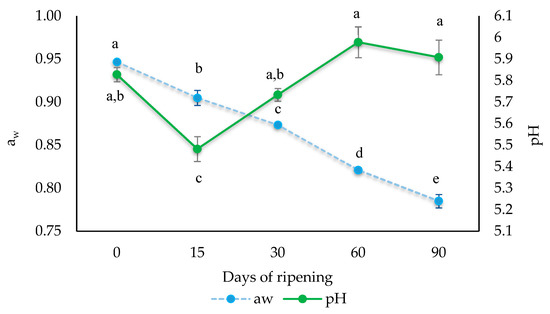 Evolution of water activity (aw) and pH of dry-cured fermented sausages “salchichón” throughout the ripening process. Different letters indicate significant differences in the same parameter at the different ripening days (p ≤0.05).