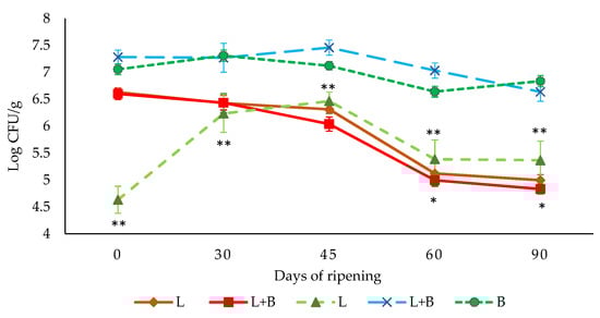 Growth curves of the LAB populations (dashed line) during the ripening process of dry-fermented sausages for batch B (●), L (▲) and batch L + B (X) and L. monocytogenes populations (solid line) for batch L (♦) and batch L + B (▪). (*) indicates significant differences (p ≤ 0.05) between batches of L. monocytogenes and (**) between batches of LAB.