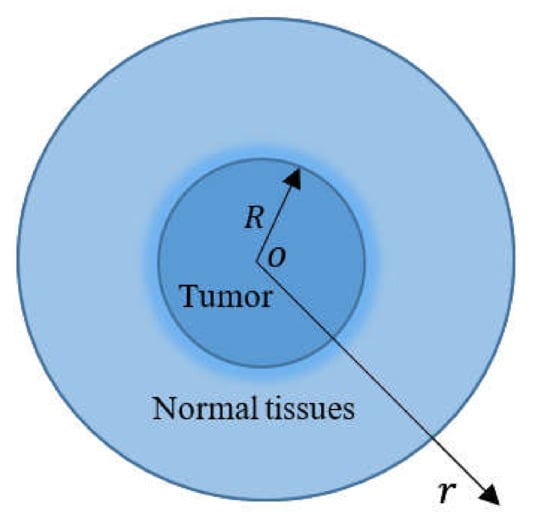 As seen in Figure 1, a small tumor is treated as a solid sphere with a radius , and it becomes a heat source with a constant energy density, , to excite an alternating magnetic field in the small tumor. With the origin used as the center of the sphere, we consider the spherical polar coordinates (, , ). Heat travels evenly in the direction of the radius when . The temperature change in the tumor () and in the normal tissues () depends on the distance from the center of the sphere and on time . The field variables of the sphere under discussion become axially symmetric due to their axial symmetric shape, material properties, and loading conditions. As a result, the system of differential equations is simplified into a one-dimensional system, assuming a time-dependent metabolic heat source, , in the tumor, and a constant in the normal tissues, whilst ignoring external heat sources, . In Figure 1, the temperature is accumulated in an area concentric with the tumor and extending to the radius .
